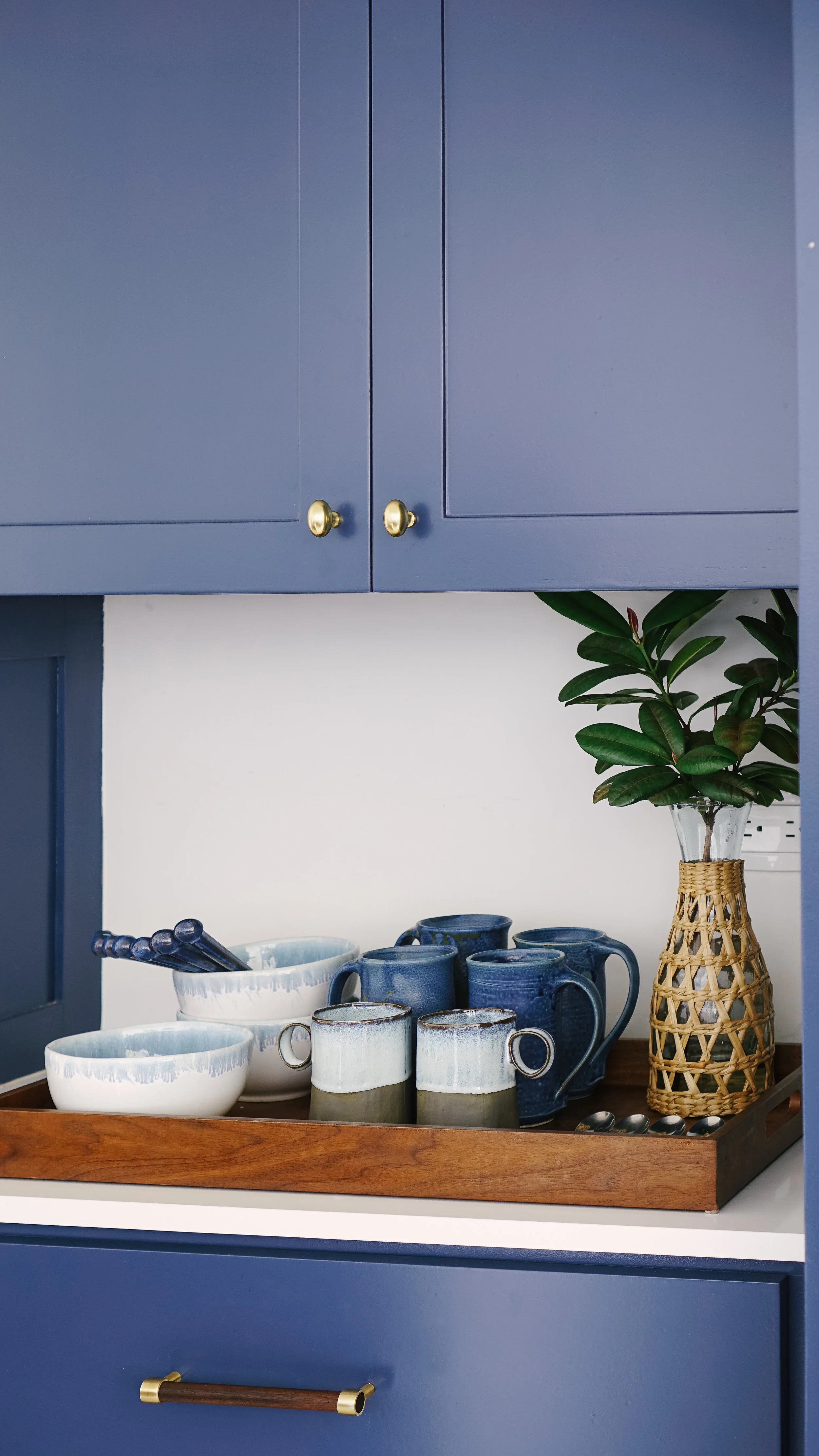 A fresh interpretation of a “Caribbean Kitchen”. Rich blues with hand made painterly tiles paired with warm woods and mixed metals creates a collected curated look.